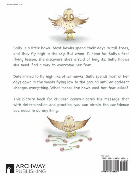 Sally is a little hawk. Most hawks spend their days in tall trees, and they fly high in the sky. But when it's time for Sally's first flying lesson, she discovers she's afraid of heights. Sally knows she must find a way to overcome her fear. Determined to fly high like other hawks, Sally spends most of her days down in the woods flying low to the ground until an accident changes everything. What makes the hawk cast her fear aside? This picture book for children communicates the message that with determination and practice, you can obtain the confidence you need to do anything.
