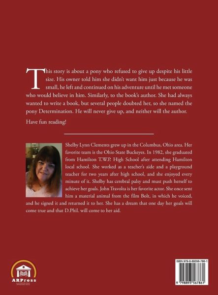 This story is about a pony who refused to give up despite his little size. His owner told him she didn't want him just because he was small, he left and continued on his adventure until he met someone who would believe in him. Similarly, to the book's author. She had always wanted to write a book, but several people doubted her, so she named the pony Determination. He will never give up, and neither will the author. Have fun reading!