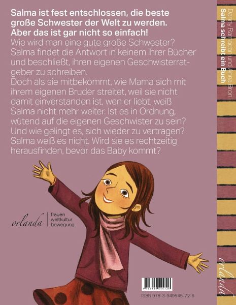 Wie kann ich die beste große Schwester werden? Diese Frage beschäftigt Salma, seit sie erfahren hat, dass ihre Mama ein Baby bekommt. Weil sie diese Aufgabe sehr ernst nimmt und auf viele ihrer Fragen keine Antworten findet, beschließt Salma, ihren eigenen kleinen Ratgeber zu schreiben. Sie beobachtet und befragt ihre Schulfreund_innen, sammelt Materialien, notiert ihre Gedanken und bald ist ihr Buch fertig.