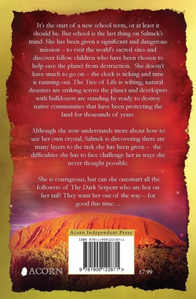 It's the start of a new school term, or at least it should be. But school is the last thing on Salmek's mind. She has been given a significant and dangerous mission - to visit the world's sacred sites and discover fellow children who have been chosen to help save the planet from destruction. She doesn't have much to go on - the clock is ticking and time is running out. The Tree of Life is wilting, natural disasters are striking across the planet and developers with bulldozers are standing by ready to destroy native communities that have been protecting the land for thousands of years. Although she now understands more about how to use her own crystal, Salmek is discovering there are many layers to the task she has been given - the difficulties she has to face challenge her in ways she never thought possible. She is courageous, but can she outsmart all the followers of The Dark Serpent who are hot on her tail? They want her out of the way - for good this time...