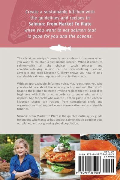 When you want to maintain a sustainable kitchen, the cliché, knowledge is power, is more relevant than ever. When it comes to salmon-with all the choices, catchphrases, and eco-labels-buying salmon can be overwhelming. Seafood advocate and cook Maureen C. Berry shows you how to be a sustainable salmon shopper and conscientious cook with Salmon From Market To Plate when you want to eat salmon that is good for you and the oceans. With an approachable, informed voice, Maureen shows you why you should care about the salmon you buy and eat. Then you'll head to the kitchen to discover which tools and pantry essentials make you a salmon-cooking success. She shares easy, delicious Everyday Recipes that will appeal to beginners with little or no experience to cooks who want to impress. And for cooks who want to up their game in the kitchen, Maureen shares ten Chef-Inspired Recipes from celebrity chefs who support ocean conservation and sustainable fisheries. Salmon From Market to Plate when you want to eat salmon that is good for you and the oceans is the quintessential quick guide for anyone who wants to buy and eat salmon that is good for you, our planet, and our growing global population.