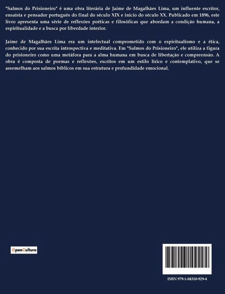 "Salmos do Prisioneiro" é uma obra literária de Jaime de Magalhães Lima, um influente escritor, ensaísta e pensador português do final do século XIX e início do século XX. Publicado em 1896, este livro apresenta uma série de reflexões poéticas e filosóficas que abordam a condição humana, a espiritualidade e a busca por liberdade interior. Jaime de Magalhães Lima era um intelectual comprometido com o espiritualismo e a ética, conhecido por sua escrita introspectiva e meditativa. Em "Salmos do Prisioneiro", ele utiliza a figura do prisioneiro como uma metáfora para a alma humana em busca de libertação e compreensão. A obra é composta de poemas e reflexões, escritos em um estilo lírico e contemplativo, que se assemelham aos salmos bíblicos em sua estrutura e profundidade emocional.
