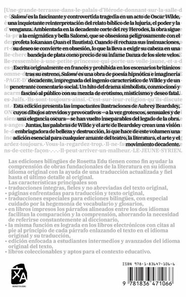Salomé es la fascinante y controvertida tragedia en un acto de Oscar Wilde, una inquietante reinterpretación del relato bíblico de la lujuria, el poder y la venganza. Ambientada en la decadente corte del rey Herodes, la obra sigue a la enigmática y bella Salomé, que se obsesiona peligrosamente con el profeta Iokanaan (Juan el Bautista). Cuando él rechaza sus insinuaciones, su deseo se convierte en obsesión, lo que la lleva a exigir su cabeza en una bandeja de plata como precio de su infame Danza de los siete velos. Escrita originalmente en francés y prohibida en los escenarios británicos tras su estreno, Salomé es una obra de poesía hipnótica e imaginería decadente, impregnada del ingenio característico de Wilde y de un penetrante comentario social. Un hito del drama simbolista, conmocionó y fascinó al público con su mezcla de erotismo, misticismo y deseo fatal. Esta edición presenta las impactantes ilustraciones de Aubrey Beardsley, cuyos dibujos atrevidos y provocativos -a la vez grotescos, sensuales y de una elegancia oscura- se han vuelto inseparables del legado de la obra. Juntas, las palabras de Wilde y el arte de Beardsley crean una visión embriagadora de belleza y destrucción, lo que hace de este volumen una adición esencial para cualquier amante del teatro, la literatura, el arte y el movimiento decadente.