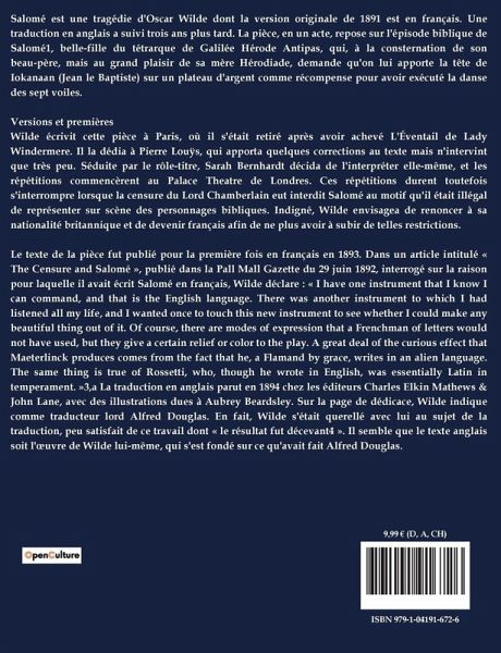 Salomé est une tragédie d'Oscar Wilde dont la version originale de 1891 est en français. Une traduction en anglais a suivi trois ans plus tard. La pièce, en un acte, repose sur l'épisode biblique de Salomé1, belle-fille du tétrarque de Galilée Hérode Antipas, qui, à la consternation de son beau-père, mais au grand plaisir de sa mère Hérodiade, demande qu'on lui apporte la tête de Iokanaan (Jean le Baptiste) sur un plateau d'argent comme récompense pour avoir exécuté la danse des sept voiles. Versions et premières Wilde écrivit cette pièce à Paris, où il s'était retiré après avoir achevé L'Éventail de Lady Windermere. Il la dédia à Pierre Louÿs, qui apporta quelques corrections au texte mais n'intervint que très peu. Séduite par le rôle-titre, Sarah Bernhardt décida de l'interpréter elle-même, et les répétitions commencèrent au Palace Theatre de Londres. Ces répétitions durent toutefois s'interrompre lorsque la censure du Lord Chamberlain eut interdit Salomé au motif qu'il était illégal de représenter sur scène des personnages bibliques. Indigné, Wilde envisagea de renoncer à sa nationalité britannique et de devenir français afin de ne plus avoir à subir de telles restrictions. Le texte de la pièce fut publié pour la première fois en français en 1893. Dans un article intitulé « The Censure and Salomé », publié dans la Pall Mall Gazette du 29 juin 1892, interrogé sur la raison pour laquelle il avait écrit Salomé en français, Wilde déclare : « I have one instrument that I know I can command, and that is the English language. There was another instrument to which I had listened all my life, and I wanted once to touch this new instrument to see whether I could make any beautiful thing out of it. Of course, there are modes of expression that a Frenchman of letters would not have used, but they give a certain relief or color to the play. A great deal of the curious effect that Maeterlinck produces comes from the fact that he, a Flamand by grace, writes in an alien language. The same thing is true of Rossetti, who, though he wrote in English, was essentially Latin in temperament. »3,a La traduction en anglais parut en 1894 chez les éditeurs Charles Elkin Mathews & John Lane, avec des illustrations dues à Aubrey Beardsley. Sur la page de dédicace, Wilde indique comme traducteur lord Alfred Douglas. En fait, Wilde s'était querellé avec lui au sujet de la traduction, peu satisfait de ce travail dont « le résultat fut décevant4 ». Il semble que le texte anglais soit l'¿uvre de Wilde lui-même, qui s'est fondé sur ce qu'avait fait Alfred Douglas.