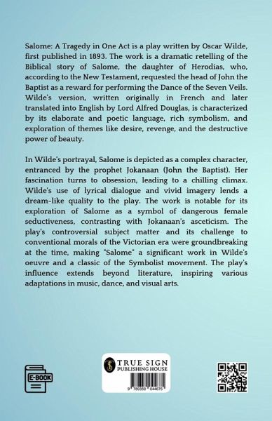 ""Salomé: A Tragedy in One Act"" is a play written by Oscar Wilde in 1891, inspired by the biblical story of Salome. Set in the court of King Herod, the play unfolds as a dark and provocative tale of desire, power, and revenge. At the center of the drama is Princess Salomé, who becomes infatuated with John the Baptist, also known as Jokanaan. When Jokanaan rejects her advances, Salomé's obsession turns to a deadly fixation, leading to a chilling climax of dance, seduction, and murder. Wilde's ""Salomé"" is characterized by its rich symbolism, lush language, and exploration of taboo themes such…mehr
