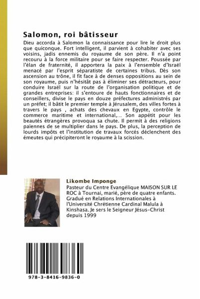 Dieu accorda à Salomon la connaissance pour lire le droit plus que quiconque. Fort intelligent, il parvient à cohabiter avec ses voisins, jadis ennemis du royaume de son père. Il n a point recouru à la force militaire pour se faire respecter. Poussée par l élan de fraternité, il apportera la paix à l ensemble d Israël menacé par l esprit séparatiste de certaines tribus. Dès son ascension au trône, il fit face à de denses oppositions au sein de son royaume, puis n hésitât pas à éliminer ses détracteurs, pour conduire Israël sur la route de l organisation politique et de grandes entreprises: il s entoure de hauts fonctionnaires et de conseillers, divise le pays en douze préfectures administrés par un préfet; il bâtit le premier temple à Jérusalem, des villes fortes à travers le pays , achats des chevaux en Egypte, contrôle le commerce maritime et international, Son appétit pour les beautés étrangères provoqua sa chute. Il permit à des religions païennes de se multiplier dans le pays. De plus, la perception de lourds impôts et l institution de travaux forcés déclenchent des émeutes qui précipiteront le royaume à la scission.