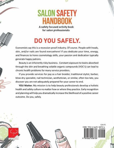 DO YOU SAFELY Economists say this is a recession-proof industry. Of course. People with heads, skin, and/or nails are found everywhere! If you dedicate your time, energy, and finances to hone cosmetology skills, your passion and dedication typically generate happy patrons. Beauty is an inherently risky business. Constant exposure to toxins absorbed through the skin and breathing volatile organic compounds (VOC's) can lead to chronic health problems for many service providers. If you provide services for pay as a hair braider, traditional stylist, barber, blow-dry specialist, nail technician, aesthetician, or similar, often too late, you discover you are not adequately prepared for your career to end. YOU Matter. My mission is to help beauty professionals develop a holistic health and safety culture no matter how or where they practice. Early recognition and planning will help you dramatically increase the likelihood of a positive career outcome. Do you, safely.