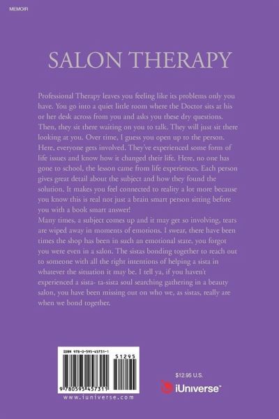 Professional Therapy leaves you feeling like its problems only you have. You go into a quiet little room where the Doctor sits at his or her desk across from you and asks you these dry questions. Then, they sit there waiting on you to talk. They will just sit there looking at you. Over time, I guess you open up to the person. Here, everyone gets involved. They've experienced some form of life issues and know how it changed their life. Here, no one has gone to school, the lesson came from life experiences. Each person gives great detail about the subject and how they found the solution. It makes you feel connected to reality a lot more because you know this is real not just a brain smart person sitting before you with a book smart answer! Many times, a subject comes up and it may get so involving, tears are wiped away in moments of emotions. I swear, there have been times the shop has been in such an emotional state, you forgot you were even in a salon. The sistas bonding together to reach out to someone with all the right intentions of helping a sista in whatever the situation it may be. I tell ya, if you haven't experienced a sista- ta-sista soul searching gathering in a beauty salon, you have been missing out on who we, as sistas, really are when we bond together.