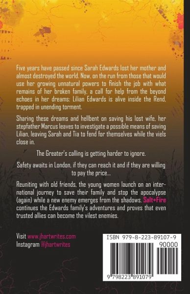 Five years have passed since Sarah Edwards lost her mother and almost destroyed the world. Now, on the run from those that would use her growing unnatural powers to finish the job with what remains of her broken family, a call for help from the beyond echoes in her dreams: Sarah's mother Lilian is alive inside the Rend, trapped in unending torment. Sharing these dreams and hellbent on saving his lost wife, Sarah's stepfather Marcus leaves to investigate a possible means of rescuing Lilian, leaving Sarah and Tia to fend for themselves while the viels close in. The Greater's call is getting harder to ignore. And a new threat is hiding in the shadows. Safety awaits in London if the girls can outrun the monsters chasing them… and if they are willing to pay the price. Reuniting with old friends, the young women launch on an international journey to save their family and stop the apocalypse (again). SALT+FIRE continues the Edwards family's adventures and proves that even trusted allies can become the vilest enemies.