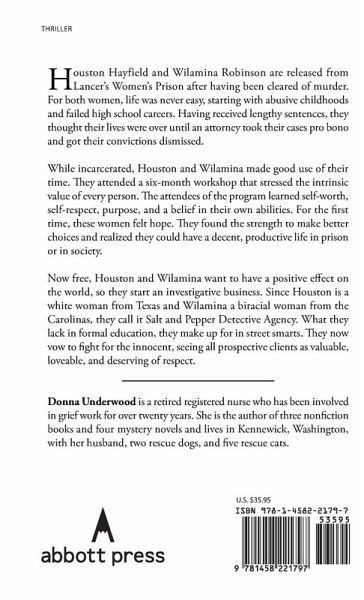 Houston Hayfield and Wilamina Robinson are released from Lancers Womens Prison after having been cleared of murder. For both women, life was never easy, starting with abusive childhoods and failed high school careers. Having received lengthy sentences, they thought their lives were over until an attorney took their cases pro bono and got their convictions dismissed. While incarcerated, Houston and Wilamina made good use of their time. They attended a six-month workshop that stressed the intrinsic value of every person. The attendees of the program learned self-worth, self-respect, purpose, and a belief in their own abilities. For the first time, these women felt hope. They found the strength to make better choices and realized they could have a decent, productive life in prison or in society. Now free, Houston and Wilamina want to have a positive effect on the world, so they start an investigative business. Since Houston is a white woman from Texas and Wilamina a biracial woman from the Carolinas, they call it Salt and Pepper Detective Agency. What they lack in formal education, they make up for in street smarts. They now vow to fight for the innocent, seeing all prospective clients as valuable, loveable, and deserving of respect.