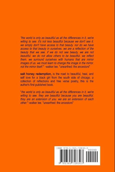 "the world is only as beautiful as all the differences in it we're willing to see. you are human. you are black. you are woman. not always in that order." -walker lee. salt honey redemption, is the road to beautiful, heal, and self-love for a black girl from the south side of chicago. a collection of reflections, prose poetry, and free verse poetry; this is the author's first published book. twitter.com: @walkerjolee2075 medium.com: @walkerjo lee