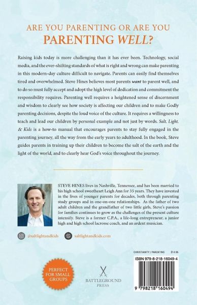 ARE YOU PARENTING OR ARE YOU PARENTING WELL? Raising kids today is more challenging than it has ever been. Technology, social media, and the ever-shifting standards of what is right and wrong can make parenting in modern-day culture difficult to navigate. If we want to win the battle as parents, we need to have the desire to truly parent well. If we want to parent well, we must resolve to make parenting more important than almost anything else and give it the effort and attention that's required. With all the outside influences that kids are facing every single day, parenting well requires a heightened sense of commitment and discernment, as well as a willingness to lead by example. Most parents want to do the best job they can, and with much focus and effort can succeed in this very noble desire and responsibility. In Salt, Light, and Kids, Steve Hines helps parents train up their children to become the salt of the earth and the light of the world and to hear God's voice above all the competing voices vying for their attention. "Whether you're expecting your first child or in the frontlines of the teen years, you will discover Salt, Light, & Kids to be an invaluable resource for your parenting journey."--CHRIS HODGES, NY Times bestselling author and Senior Pastor of Church of the Highlands, Birmingham, AL