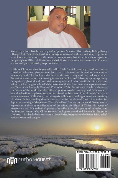 Written by a born Prophet and reputable Spiritual Scientist, His Lordship Bishop Bassey Effiong Orok; Salt of the Earth is a package of universal realities, and an eye-opener to all of humanity, as it unveils the universal components that are within the occupant of the prestigious Office of Christhood called Christ, as it combines mysteries of eternal science and pure spirituality to prove its facts. It likens Christ to what is generally called ?Salt,? which naturally transforms into a crystalline substance, gives seawater its characteristic taste and is used for seasoning or preserving food. This book reveals Christ as the natural origin of salt, making a critical discussion about salt as the seasoning instrument of life, and following up by explaining the spiritual, physical and potential meaning of salt. It also unveils the circumstances behind the first usage of salt, which hitherto was hidden from man. Among other contents are Christ as the Heavenly Taste and Controller of Salt; the existence of salt in the seven continents of the world and the different powers attached to salty and fresh water. It provides details on top issues such as the thirty-four blessings of the elects of Christ, the seven messengers of His elects, the twenty-six will-powers, and eight merriment awaiting His elects. Before revealing the salvation that awaits the elects of Christ, it examines in-depth the meaning of the phrase, ?Salt of the Earth,? as well as the ten different natural expressions of the salty manifestation of the saints, the Elects of Christ, His power of preservation and His unlimited power of manifestation, the quality of salvation, and the fourteen reasons why Christ receives the highest award and honour in the entire Universe. It is a book that cuts across all boundaries, irrespective of religion, faith, belief, nations, tribes and tongues.