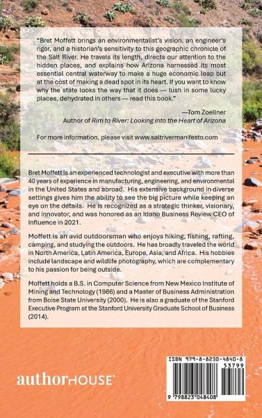"Bret Moffett brings an environmentalist's vision, an engineer's rigor, and a historian's sensitivity to this geographic chronicle of the Salt River. He travels its length, directs our attention to the hidden places, and explains how Arizona harnessed its most essential central waterway to make a huge economic leap but at the cost of making a dead spot in its heart. If you want to know why the state looks the way that it does - lush in some lucky places, dehydrated in others - read this book." -Tom Zoellner Author of Rim to River: Looking into the Heart of Arizona For more information, please visit www.saltrivermanifesto.com