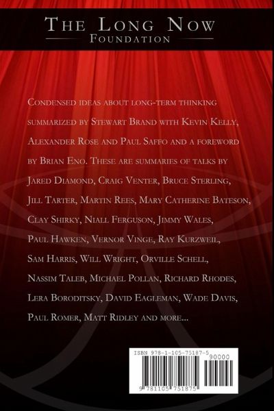 Condensed ideas about long-term thinking summarized by Stewart Brand (with Kevin Kelly, Alexander Rose and Paul Saffo) and a foreword by Brian Eno. These are summaries of talks by Jared Diamond, Craig Venter, Bruce Sterling, Jill Tarter, Martin Rees, Clay Shirky, Niall Ferguson, Jimmy Wales, Mary Catherine Bateson, Paul Hawken, Vernor Vinge, Ray Kurzweil, Sam Harris, Will Wright, Orville Schell, Nassim Taleb, Michael Pollan, Wade Davis, Lera Boroditsky, David Eagleman, Richard Rhodes, Paul Romer, Matt Ridley and more... [SALT stands for Seminars About Long-term Thinking. The SALT talks are a monthly speaking series organized in San Francisco by The Long Now Foundation.]