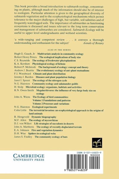 This book provides a broad introduction to saltmarsh ecology, concentrating on plants, although much of the information should also be of interest to zoologists. Particular attention is given to the geographical diversity of saltmarsh vegetation and to the ecophysiological mechanisms which permit tolerance to the major challenges of high, but variable, soil salinities and of frequently waterlogged soils. The importance of saltmarshes as functioning ecosystems is discussed and issues relevant to the long term conservation and management of saltmarshes are considered. "Saltmarch Ecology" will be useful to upper level undergraduates and wetland scientists.