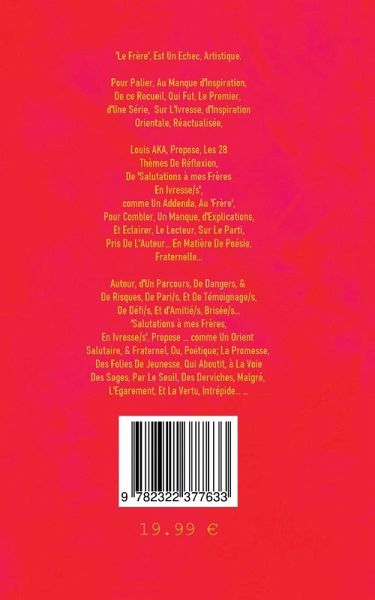 "Salutations à mes FrèresEn Ivresse"est un ouvrage en deuxvolumes.Il appartient à lacollection,"Le Frère",du Titre du premierLivre,de cette Série."Le Frère Vol.2 et 3,sont prévus,pour clore,cetteCollection."Le Frère", est un échec, artistique.Pour palier au manque, d'inspiration,de ce Recueil, qui fut, le premier d'uneSérie, sur l'Ivresse d'InspirationOrientale Réactualisée,Louis AKA, propose les 28 ThèmesDe Réflexion, de "Salutationsà mes Frères En Ivresse",comme un Addenda, au "Frère",pour combler un manque d'explications,et éclairer le Lecteur, sur le parti prisde l'Auteur...en Matière de Poésie Fraternelle...Autour d'un parcours, de Dangers EtRisques, de Paris, Et de Témoignages,"Salutations à mes Frères EnIvresse", propose... comme unOrient Salutaire et Fraternel,ou Poétique;la Promesse, des Folies de Jeunesse,qui aboutit à la Voie des Sages,par le Seuil des Derviches,malgré l'Egarement, et la VertuIntrépide...AKA Louis Est Poète Et Illustrateur.Auteur de Nombreux,Opus Poétiques,Sur Différents, Médias.Ses Ouvrages Majeurs,Sont,"ô, Rose Noire d'Iran","La Fleur de Sincérité","Les Lettres Marginales","Les Lettresd'Arabismes",Et Salutations à mes FrèresEn Ivresses Vol.1 Et 2"...