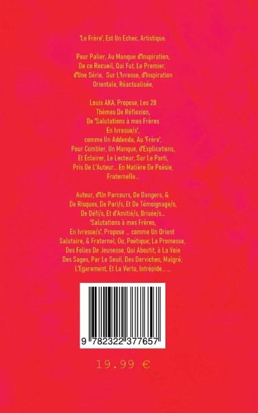 "Salutations à mes FrèresEn Ivresse"est un ouvrage en deuxvolumes.Il appartient à lacollection,"Le Frère",du Titre du premierLivre,de cette Série."Le Frère Vol.2 et 3,sont prévus,pour clore,cetteCollection."Le Frère", est un échec, artistique.Pour palier au manque, d'inspiration,de ce Recueil, qui fut, le premier d'uneSérie, sur l'Ivresse d'InspirationOrientale Réactualisée,Louis AKA, propose les 28 ThèmesDe Réflexion, de "Salutationsà mes Frères En Ivresse",comme un Addenda, au "Frère",pour combler un manque d'explications,et éclairer le Lecteur, sur le parti prisde l'Auteur...en Matière de Poésie Fraternelle...Autour d'un parcours, de Dangers EtRisques, de Paris, Et de Témoignages,"Salutations à mes Frères EnIvresse", propose... comme unOrient Salutaire et Fraternel,ou Poétique;la Promesse, des Folies de Jeunesse,qui aboutit à la Voie des Sages,par le Seuil des Derviches,malgré l'Egarement, et la VertuIntrépide...AKA Louis Est Poète Et Illustrateur.Auteur de Nombreux,Opus Poétiques,Sur Différents, Médias.Ses Ouvrages Majeurs,Sont,"ô, Rose Noire d'Iran","La Fleur de Sincérité","Les Lettres Marginales","Les Lettresd'Arabismes",Et Salutations à mes FrèresEn Ivresses Vol.1 Et 2"...