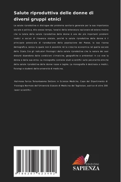 La salute riproduttiva si distingue dal problema sanitario generale per la sua importanza sociale e politica. Allo stesso tempo, l'analisi della letteratura nazionale ed estera mostra che la tutela della salute riproduttiva delle donne è uno dei più importanti problemi medici e sociali di rilevanza statale, poiché la salute riproduttiva delle donne è il principale potenziale di riproduzione della popolazione del Paese, la sua risorsa demografica, senza la quale non è possibile né la crescita economica né quella sociale dello Stato. Sia gli indicatori fisiologici della salute riproduttiva che la natura dei suoi disturbi dipendono dalle condizioni climatiche, geografiche e ambientali in cui vive la donna e dalla sua etnia. La monografia contiene studi scientifici sulle peculiarità etniche della salute riproduttiva delle donne russe e tagike. La monografia è destinata a medici, fisiologi e studenti delle università di medicina.