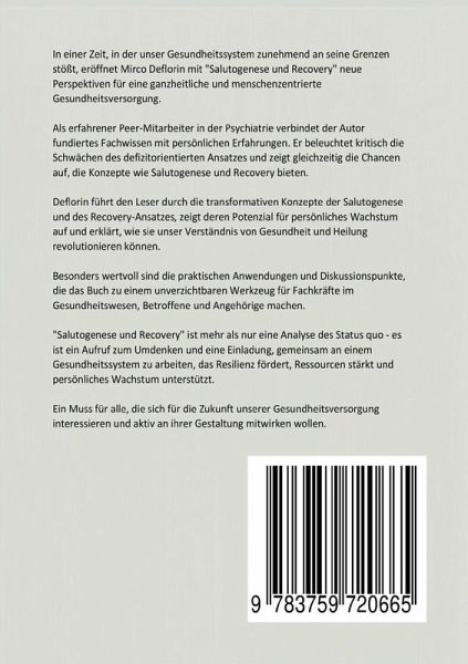 In einer Zeit, in der unser Gesundheitssystem zunehmend an seine Grenzen stösst, eröffnet Mirco Deflorin mit "Salutogenese und Recovery" neue Perspektiven für eine ganzheitliche und menschenzentrierte Gesundheitsversorgung. Als erfahrener Peer-Mitarbeiter in der Psychiatrie verbindet der Autor fundiertes Fachwissen mit persönlichen Erfahrungen. Er beleuchtet kritisch die Schwächen des defizitorientierten Ansatzes und zeigt gleichzeitig die Chancen auf, die Konzepte wie Salutogenese und Recovery bieten. Deflorin führt den Leser durch die transformativen Konzepte der Salutogenese und des Recovery-Ansatzes, zeigt deren Potenzial für persönliches Wachstum auf und erklärt, wie sie unser Verständnis von Gesundheit und Heilung revolutionieren können. Besonders wertvoll sind die praktischen Anwendungen und Diskussionspunkte, die das Buch zu einem unverzichtbaren Werkzeug für Fachkräfte im Gesundheitswesen, Betroffene und Angehörige machen. "Salutogenese und Recovery" ist mehr als nur eine Analyse des Status quo - es ist ein Aufruf zum Umdenken und eine Einladung, gemeinsam an einem Gesundheitssystem zu arbeiten, das Resilienz fördert, Ressourcen stärkt und persönliches Wachstum unterstützt. Ein Muss für alle, die sich für die Zukunft unserer Gesundheitsversorgung interessieren und aktiv an ihrer Gestaltung mitwirken wollen.