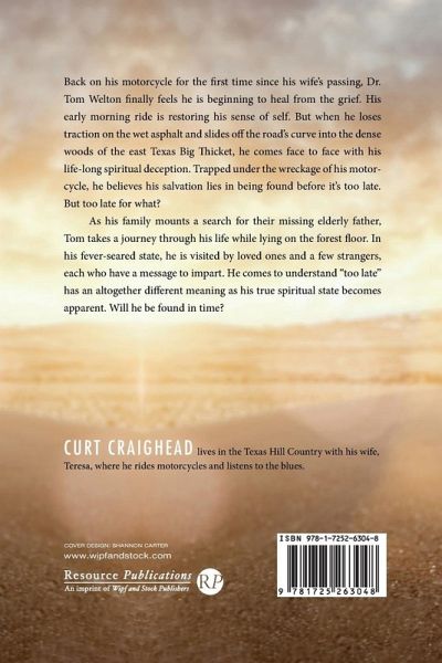 Back on his motorcycle for the first time since his wife's passing, Dr. Tom Welton finally feels he is beginning to heal from the grief. His early morning ride is restoring his sense of self. But when he loses traction on the wet asphalt and slides off the road's curve into the dense woods of the east Texas Big Thicket, he comes face to face with his life-long spiritual deception. Trapped under the wreckage of his motorcycle, he believes his salvation lies in being found before it's too late. But too late for what? As his family mounts a search for their missing elderly father, Tom takes a journey through his life while lying on the forest floor. In his fever-seared state, he is visited by loved ones and a few strangers, each who have a message to impart. He comes to understand ""too late"" has an altogether different meaning as his true spiritual state becomes apparent. Will he be found in time?