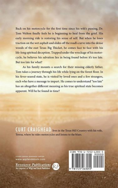 Back on his motorcycle for the first time since his wife's passing, Dr. Tom Welton finally feels he is beginning to heal from the grief. His early morning ride is restoring his sense of self. But when he loses traction on the wet asphalt and slides off the road's curve into the dense woods of the east Texas Big Thicket, he comes face to face with his life-long spiritual deception. Trapped under the wreckage of his motorcycle, he believes his salvation lies in being found before it's too late. But too late for what? As his family mounts a search for their missing elderly father, Tom takes a journey through his life while lying on the forest floor. In his fever-seared state, he is visited by loved ones and a few strangers, each who have a message to impart. He comes to understand ""too late"" has an altogether different meaning as his true spiritual state becomes apparent. Will he be found in time?