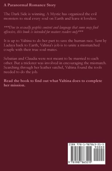 A Paranormal Romance Story The Dark Side is winning. A Mystic has organized the evil monsters to steal every soul on Earth and leave it loveless. ***Due to sexually graphic content and language that some may find offensive, this book is intended for mature readers only*** It is up to Valtina to do her part to save the human race. Sent by Ladaya back to Earth, Valtina's job is to unite a mismatched couple with their true soul-mates. Sebatian and Claudia were not meant to be married to each other. But a trickster was involved in encouraging the mismatch. Searching through her leather satchel, Valtina found the tools needed to do the job. Read the book to find out what Valtina does to complete her mission.
