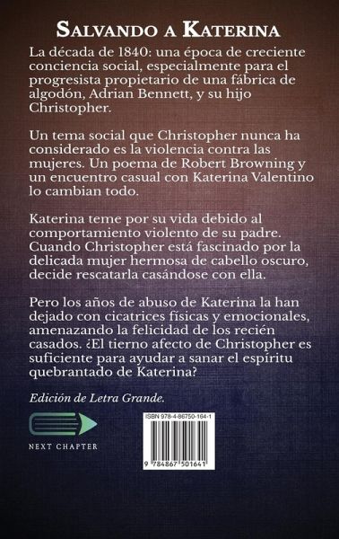 La década de 1840: una época de creciente conciencia social, especialmente para el progresista propietario de una fábrica de algodón, Adrian Bennett, y su hijo Christopher. Un tema social que Christopher nunca ha considerado es la violencia contra las mujeres. Un poema de Robert Browning y un encuentro casual con Katerina Valentino lo cambian todo. Katerina teme por su vida debido al comportamiento violento de su padre. Cuando Christopher está fascinado por la delicada mujer hermosa de cabello oscuro, decide rescatarla casándose con ella. Pero los años de abuso de Katerina la han dejado con cicatrices físicas y emocionales, amenazando la felicidad de los recién casados. ¿El tierno afecto de Christopher es suficiente para ayudar a sanar el espíritu quebrantado de Katerina? ¿Edición de Letra Grande