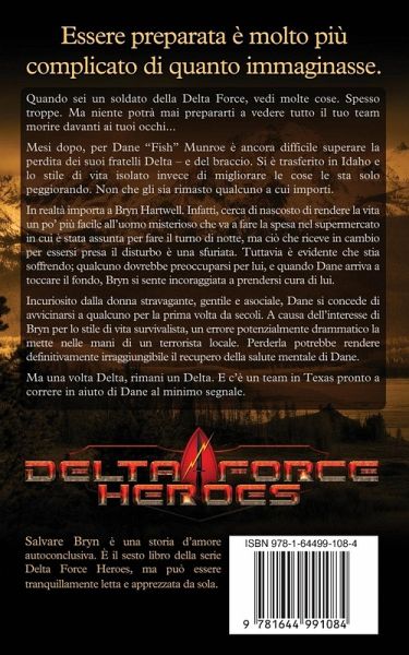 Quando sei un soldato della Delta Force, vedi molte cose. Spesso troppe. Ma niente potrà mai prepararti a vedere tutto il tuo team morire davanti ai tuoi occhi... Mesi dopo, per Dane "Fish" Munroe è ancora difficile superare la perdita dei suoi fratelli Delta - e del braccio. Si è trasferito in Idaho e lo stile di vita isolato invece di migliorare le cose le sta solo peggiorando. Non che gli sia rimasto qualcuno a cui importi. In realtà importa a Bryn Hartwell. Infatti, cerca di nascosto di rendere la vita un po' più facile all'uomo misterioso che va a fare la spesa nel supermercato in cui è stata assunta per fare il turno di notte, ma ciò che riceve in cambio per essersi presa il disturbo è una sfuriata. Tuttavia è evidente che stia soffrendo; qualcuno dovrebbe preoccuparsi per lui, e quando Dane arriva a toccare il fondo, Bryn si sente incoraggiata a prendersi cura di lui. Incuriosito dalla donna stravagante, gentile e asociale, Dane si concede di avvicinarsi a qualcuno per la prima volta da secoli. A causa dell'interesse di Bryn per lo stile di vita survivalista, un errore potenzialmente drammatico la mette nelle mani di un terrorista locale. Perderla potrebbe rendere definitivamente irraggiungibile il recupero della salute mentale di Dane. Ma una volta Delta, rimani un Delta. E c'è un team in Texas pronto a correre in aiuto di Dane al minimo segnale. ** Salvare Bryn è il sesto libro della serie Delta Force Heroes. Ogni libro è autoconclusivo, senza cliffhanger.