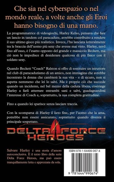 La programmatrice di videogiochi, Harley Kelso, pensava che fare un lancio in tandem col paracadute, avrebbe contribuito a rendere il suo ultimo gioco più realistico. Invece, l'ha lanciata letteralmente tra le braccia dell'uomo più sexy che avesse mai visto. Harley, nerd fino all'osso, è l'esatto opposto del grande e massiccio Beckett, ma ciò non le impedisce di desiderare qualcosa di più fisico con il soldato sexy. Quando Beckett "Coach" Ralston si offre di sostituire un istruttore nel club di paracadutismo di un amico, non immagina che avrebbe incontrato la donna che cambierà la sua vita - e di sicuro, non si aspetta nemmeno che lei lo salvi. Ma è proprio ciò che succede quando un incidente, nel bel mezzo della caduta libera, costringe Harley a farli atterrare entrambi sani e salvi, guadagnandosi l'interesse di Coach e, soprattutto, la sua completa gratitudine. Fino a quando lei sparisce senza lasciare traccia. Con la scomparsa di Harley il lieto fine, per l'uomo che la ama, potrebbe non essere assicurato, soprattutto quando diventa il principale sospettato. ** Salvare Harley è il terzo libro della serie Delta Force Heroes. Ogni libro è autoconclusivo, senza cliffhanger.