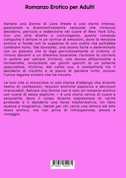 Salvare una Donna di Lara Steele è una storia intensa, passionale e drammaticamente sensuale che intreccia desiderio, pericolo e redenzione nel cuore di New York City. Con uno stile diretto e coinvolgente, questo romanzo catapulta il lettore in un vortice di emozioni, dove la tensione erotica si fonde con la suspense di una scelta che potrebbe cambiare tutto. Tae Gonzalez, una donna forte e determinata con un passato che la lega pericolosamente al crimine, si ritrova davanti a un dilemma lacerante: rischiare la carriera in polizia per salvare Victoria, una donna affascinante e tormentata, invischiata nei giochi sporchi di un potente spacciatore. Victoria, dal canto suo, è combattuta tra il desiderio di riscatto e la paura di perdere tutto, incluso l'unico legame sincero che ha trovato. Le loro vite si incrociano in una stanza d'albergo che diventa teatro di confessioni, tensioni erotiche esplosive e decisioni irrevocabili. Salvare una Donna non è solo un romanzo erotico con scenedi sesso esplicito - è una storia carica di cuore e sensualità, dove il corpo diventa espressione di verità profonde e il desiderio una forza trasformativa. Un libro audace e magnetico, ideale per chi cerca una lettura ad alto tasso erotico, ma non priva di introspezione, amore e coraggio.