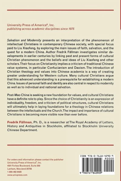Salvation and Modernity presents an interpretation of the phenomenon of intellectual Christians in contemporary Chinese society, with special focus paid to Liu Xiaofeng, by exploring the main issues of faith, salvation, and the quest for a modern China. Author Fredrik Fällman investigates similar developments in earlier centuries by linking past and present forms of cultural Christian phenomenon, and the beliefs and ideas of Liu Xiaofeng and other scholars. Their focus on Christianity implies a criticism of traditional Chinese value systems, in particular Confucianism and Daoism. The introduction of Christian theology and values into Chinese academia is a way of creating greater understanding for Western culture. Many cultural Christians argue that this advanced understanding is a prerequisite for establishing a modern China. Issues of personal faith and identity are also central in respect to modernity as well as to individual and national salvation. Post-Mao China is seeking a new foundation for values and cultural Christians have a definite role to play. Since the choice of Christianity is an expression of individuality, freedom, and criticism of political structures, cultural Christians will ultimately help in laying foundations for a theology in Chinese relations between the intellectuals and the Church. The impact and importance of cultural Christians is becoming more visible now than ever before.