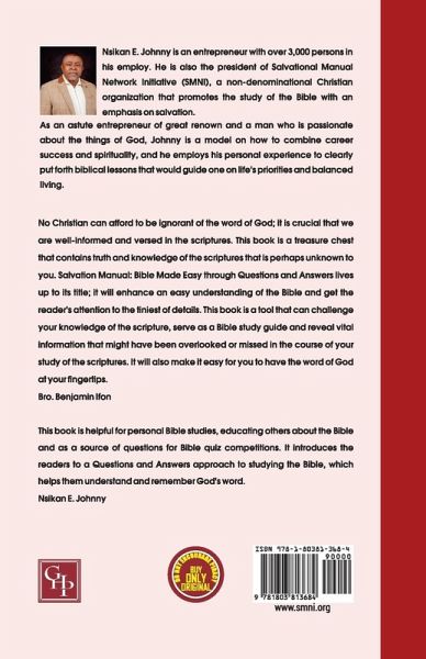 Salvation Manual: Bible Made Easy through Questions and Answers for the book of Jeremiah is one of several books in the Salvation Manual: Bible Made Easy through Questions and Answers series. Like other books in the series, it adopts a questions and answers pattern in identifying and breaking down biblical truths in a way that will be easily understood and internalised. In a spectacular method of using questions and answers, it unravels every message, event, and character from all the chapters in the book of Jeremiah. The book consists of fifty-two chapters, one for each chapter of the book of Jeremiah. The questions and answers are placed at the end of each chapter to assess the degree to which the reader understands the chapter read as well as how much of the details of the chapter they retained. The book makes the reader study every chapter of the book of Jeremiah in two directions; the forward and reverse directions. The chapter of the book of Jeremiah at the beginning of each chapter of this book is the first point of contact for the reader which they have to read and understand what is contained in the chapter. After that are questions from the chapter and answers at the end of the questions, with which the reader would test their knowledge of what they had read in that chapter. These questions and answers segment presents the reader with problems which points them back to the Bible for confirmation or further studies (the forward and reverse directions). The approach to Bible studies presented in this book is remarkable as it will take its reader a step above regular Bible reading to be fully grounded in the details of the events and messages in the scriptures. The book is a tool that can challenge one's knowledge of the scripture, serve as a Bible study guide and reveal vital information that might have been overlooked or missed in the course of one's study of the scriptures.