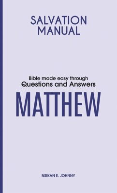 Salvation Manual: Bible Made Easy through Questions and Answers for the book of Matthew is one of several books in the Salvation Manual: Bible Made Easy through Questions and Answers series. Like other books in the series, it adopts a questions and answers pattern in identifying and breaking down biblical truths in a way that will be easily understood and internalised. In a spectacular method of using questions and answers, it unravels every message, event, and character from all the chapters in the book of Matthew. The book consists of twenty eight chapters, one for each chapter of the book of Matthew. The questions and answers are placed at the end of each chapter to assess the degree to which the reader understands the chapter read as well as how much of the details of the chapter they retained. The book makes the reader study every chapter of the book of Matthew in two directions; the forward and reverse directions. The chapter of the book of Matthew at the beginning of each chapter of this book is the first point of contact for the reader which they have to read and understand what is contained in the chapter. After that are questions from the chapter and answers at the end of the questions, with which the reader would test their knowledge of what they had read in that chapter. These questions and answers segment presents the reader with problems which points them back to the Bible for confirmation or further studies (the forward and reverse directions). The approach to Bible studies presented in this book is remarkable as it will take its reader a step above regular Bible reading to be fully grounded in the details of the events and messages in the scriptures. The book is a tool that can challenge one's knowledge of the scripture, serve as a Bible study guide and reveal vital information that might have been overlooked or missed in the course of one's study of the scriptures.