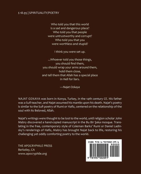 Najat Ozkaya was born in Konya, Turkey, in the 14th century CE. His father was a Sufi teacher, and Najat assumed his mantle upon his death. Najat's poetry is similar to the Sufi poetry of Rumi or Hafiz, centered on the relationship of the soul with its Beloved, Allah. Najat's writings were thought to be lost to the world, until religion scholar John Mabry discovered a hand-copied manuscript in the Bu Bir ¿aka mosque. Translating in the free, contemporary style of Coleman Barks' Rumi or Daniel Ladinsky's renderings of Hafiz, Mabry has brought Najat back to life, restoring his challenging yet oddly comforting poetry to the world. …except of course, that all of the above is nonsense. Najat Ozkaya never existed. He is the invention of the poet and religion scholar Mabry. Mabry didn't discover any long lost text, he just wrote a bunch of poems in the style of Rumi and Hafiz. And you know what? If you like Rumi or Hafiz, we're betting you'll like Najat too, whether he actually existed or not.