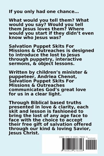 If you only had one chance. What would you tell them? What would you say? Would you tell them Jesus loves them? Where would you start if they didn't even know who Jesus was? Salvation Puppet Skits For Missions & Outreaches is designed to introduce the lost to Jesus through puppetry, interactive sermons, & object lessons. Written by children's minister & puppeteer, Andriea Chenot, Salvation Puppet Skits For Missions & Outreaches communicates God's great love for us in a clear light. Through Biblical based truths presented in love & clarity, each skit and lesson is fashioned to bring the lost of any age face to face with the choice to accept their free gift of salvation offered through our kind & loving Savior, Jesus Christ.