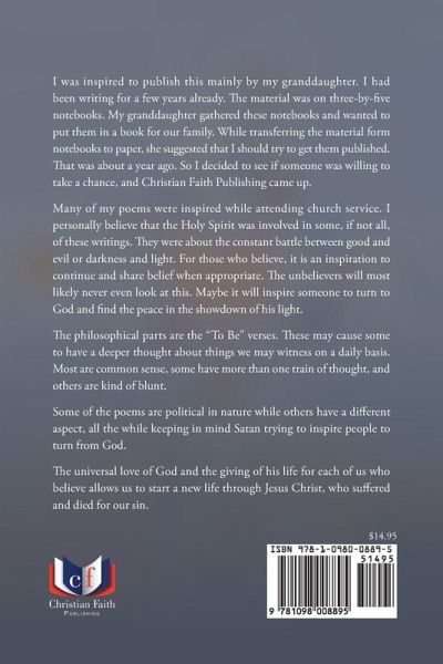 I was inspired to publish this mainly by my granddaughter. I had been writing for a few years already. The material was on three-by-five notebooks. My granddaughter gathered these notebooks and wanted to put them in a book for our family. While transferring the material form notebooks to paper, she suggested that I should try to get them published. That was about a year ago. So I decided to see if someone was willing to take a chance, and Christian Faith Publishing came up. Many of my poems were inspired while attending church service. I personally believe that the Holy Spirit was involved in some, if not all, of these writings. They were about the constant battle between good and evil or darkness and light. For those who believe, it is an inspiration to continue and share belief when appropriate. The unbelievers will most likely never even look at this. Maybe it will inspire someone to turn to God and find the peace in the showdown of his light. The philosophical parts are the "To Be" verses. These may cause some to have a deeper thought about things we may witness on a daily basis. Most are common sense, some have more than one train of thought, and others are kind of blunt. Some of the poems are political in nature while others have a different aspect, all the while keeping in mind Satan trying to inspire people to turn from God. The universal love of God and the giving of his life for each of us who believe allows us to start a new life through Jesus Christ, who suffered and died for our sin.