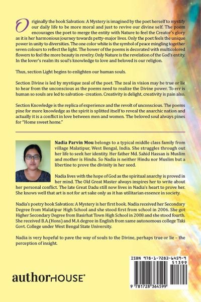 Originally the book Salvation: A Mystery is imagined by the poet herself to mystify our daily life to be more moral and just to revive our divine self. The poem encourages the poet to merge the entity with Nature to feel the Creator's glory as it is her harmonious journey towards petty-major lives. Only the poet feels the unique power in unity to diversities. The one color white is the symbol of peace mingling together seven colours to reflect the light. The bower of the poems is decorated with multicolored flowers to feel the more beauty in revelry. Only Nature is the revelation of the God's entity. In the lover's realm its soul's knowledge to love and beloved is our religion. Thus, section Light begins to enlighten our human souls. Section Divine is led by mystique zeal of the poet. The zeal in vision may be true or lie to hear from the unconscious as the poems need to realize the Divine power. To err is human so souls are led to salvation- creation. Creativity is delight, creativity is pain also. Section Knowledge is the replica of experience and the revolt of unconscious. The poems pine for more knowledge as the spirit is splitted itself to reveal the anarchic nation and actually it is a conflict in love between men and women. The beloved soul always pines for "Home sweet home."