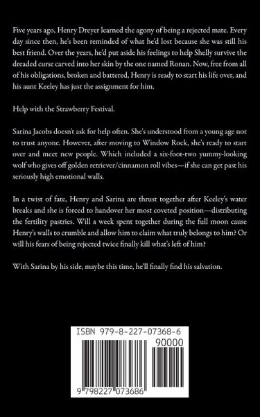 Five years ago, Henry Dreyer learned the agony of being a rejected mate. Every day since then, he's been reminded of what he'd lost because she was still his best friend. Over the years, he'd put aside his feelings to help Shelly survive the dreaded curse carved into her skin by the one named Ronan. Now, free from all of his obligations, broken and battered, Henry is ready to start his life over, and his aunt Keeley has just the assignment for him. Help with the Strawberry Festival. Sarina Jacobs doesn't ask for help often. She's understood from a young age not to trust anyone. However, after moving to Window Rock, she's ready to start over and meet new people. Which included a six-foot-two yummy-looking wolf who gives off golden retriever/cinnamon roll vibes-if she can get past his seriously high emotional walls. In a twist of fate, Henry and Sarina are thrust together after Keeley's water breaks and she is forced to handover her most coveted position-distributing the fertility pastries. Will a week spent together during the full moon cause Henry's walls to crumble and allow him to claim what truly belongs to him? Or will his fears of being rejected twice finally kill what's left of him? With Sarina by his side, maybe this time, he'll finally find his salvation.