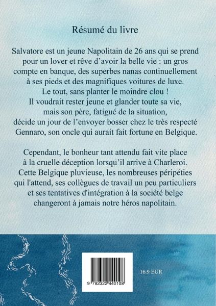 Résumé du livreSalvatore est un jeune Napolitain de 26 ans qui se prend pour un lover et reve d'avoir la belle vie. Un gros compte en banque, des superbes nanas continuellement à ses pieds et des magnifiques voitures de luxe. Le tout, sans planter le moindre clou. Il voudrait rester jeune et glander toute sa vie, mais son père, fatigué de la situation, décide un jour de l'envoyer bosser chez le très respecté Gennaro, son oncle qui aurait fait fortune en Belgique.Salvatore part donc pour le Nord, le coeur rempli d'espoir, avec l'intime conviction d'y faire rapidement fortune et de pouvoir retourner ensuite à Naples pour dépenser comme un nabab. Cependant, le bonheur tant attendu fait vite place à la cruelle déception. Salvatore découvrira rapidement que le restaurant de l'oncle Gennaro n'est qu'une gargotte située à Charleroi, ville qui est loin d'etre renommée pour ses plages, son soleil et ses nanas en bikini, mais plutot pour ses quartiers sordides, ses zones industrielles abandonnées et sa criminalité galopante. Cette Belgique pluvieuse, les nombreuses péripéties qui l'attendent, ses collègues de travail un peu particuliers et ses tentatives d'intégration à la société belge changeront à jamais notre héros napolitain. En s'éloignant de plus en plus de son ancienne personnalité, Salvatore découvrira en Belgique comment vivre avec simplicité. Du moins jusqu'au jour ou un certain oncle d'Amérique, un homme aux affaires douteuses, retournera à Naples en grande pompe pour vendre du reve de gloire et de richesse aux jeunes des quartiers défavorisés.Technique narrative et conception du romanSalvatore incarne le stéréotype de l'Italien materné, rusé, passionné et fainéant. L'entièreté de la structure narrative est basée sur l'utilisation ironique et hyberbolique des stéréotypes. Italiens, Belges, Francais et Allemands représentent des genres humains utilisés dans le roman pour raconter les expériences et l'évolution du personnage principal. Le brassage ethnique européen, par ses fascinantes ressemblances et différences, représente le fond du récit à la fois moderne, spontané et hilare, écrit intentionnellement dans un langage familier et hybride (les incursions linguistiques entre l'itlalien et le francais ne sont pas rares). La structure du roman se divise en épisodes, véritables flashs narratifs qui composent le puzzle de l'intrigue.
