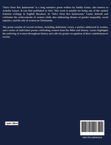 "Salve Deus Rex Judaeorum" is a long narrative poem written by Emilia Lanier, also known as Aemilia Lanyer. It was first published in 1611. This work is notable for being one of the earliest feminist writings in English literature. In "Salve Deus Rex Judaeorum," Lanier defends and celebrates the achievements of women while also addressing themes of gender inequality, social injustice, and the role of women in Christianity. The poem consists of several sections, including dedicatory verses, a preface addressed to women, and a series of individual poems celebrating women from the Bible and history. Lanier highlights the suffering of women throughout history and calls for greater recognition of their contributions to society.