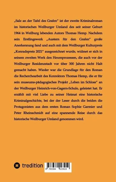 Im zweiten historischen Kriminalroman im Weilburger Umland "Salz an der Tafel des Grafen" vom Autor Thomas Hemp geht es um die Hexenprozesse in der Region im 17. Jahrhundert. Detailreich und fundiert recherchiert erzählt Hemp eine spannende Kriminalgeschichte, wie in seinem erfolgreichen ersten Roman "Austern für den Grafen.In zwei Zeitebenen, der Gegenwart und der Renaissancezeit, wird eine Geschichte geknüpft , die sich eng an historische Ereignisse hält. Das Ermittlerduo aus dem ersten Roman, Sophie Gamier und Peter Rheinschmidt, ist wieder einem Geheimnis in der Gegenwart auf der Spur, was aber seine Wurzel tief in der Geschichte der grausamen Hexenverfolgung hat, welche auch vor dem Weilburger Umland nicht halt gemacht hat. Der Leser erfährt vieles über die unbarmherzige Verfolgung unschuldiger Menschen, die aus der Mitte der Gesellschaft durch bloße Anschuldigungen in den Strudel der Folter, Verbrennung und Enthauptung geraten.