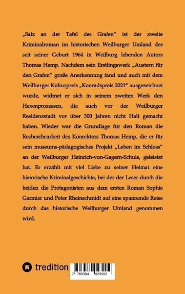 Im zweiten historischen Kriminalroman im Weilburger Umland "Salz an der Tafel des Grafen" vom Autor Thomas Hemp geht es um die Hexenprozesse in der Region im 17. Jahrhundert. Detailreich und fundiert recherchiert erzählt Hemp eine spannende Kriminalgeschichte, wie in seinem erfolgreichen ersten Roman "Austern für den Grafen.In zwei Zeitebenen, der Gegenwart und der Renaissancezeit, wird eine Geschichte geknüpft , die sich eng an historische Ereignisse hält. Das Ermittlerduo aus dem ersten Roman, Sophie Gamier und Peter Rheinschmidt, ist wieder einem Geheimnis in der Gegenwart auf der Spur, was aber seine Wurzel tief in der Geschichte der grausamen Hexenverfolgung hat, welche auch vor dem Weilburger Umland nicht halt gemacht hat. Der Leser erfährt vieles über die unbarmherzige Verfolgung unschuldiger Menschen, die aus der Mitte der Gesellschaft durch bloße Anschuldigungen in den Strudel der Folter, Verbrennung und Enthauptung geraten.