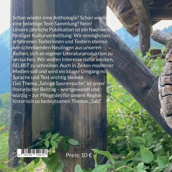 Chiemgau-Autoren e.V. Chiemgau-Autoren e.V.: Über den Herausgeber: Der Verein Chiemgau-Autoren e. V. besteht seit 2015 als Zusammenschluss von schreibenden Menschen und Freundinnen der Literatur aus dem Chiemgau und angrenzenden Regionen als gemeinnütziger Verein. Mittlerweile gibt es über 80 Mitglieder. Im Internet stellt sich der Verein unter der Adresse http://www.chiemgau-autoren.de vor. Ziele des Vereins sind, Autorinnen und Autoren zu unterstützen unabhängig von Herkunft, Religion, Muttersprache und den Formen ihres Schaffens, den kreativen Nachwuchs und die literarische Bildung durch Kinder- und Jugendarbeit zu fördern, insbesondere durch Zusammenarbeit mit Schulen, die interdisziplinäre Zusammenarbeit mit Vertretern anderer Kunstgattungen zu suchen, die Herausgabe von Medien in gedruckter und elektronischer Form zu realisieren, Lesungen, Schreibwerkstätten und andere Formen der Vermittlung von Literatur zu organisieren. Dabei ist der Verein selbstlos tätig, überparteilich, überkonfessionell und antirassistisch und verfolgt ausschließlich und unmittelbar gemeinnützige Zwecke im Sinne des Abschnitts steuerbegünstigte Zwecke der Abgabenordnung. Ein jährlich wiederkehrendes Projekt ist ein gemeinsames Schreibunternehmen als literarisches Experiment. Die Ergebnisse veröffentlicht der Verein in einer Anthologie-Reihe, die bislang fünf Bände umfasst: Band 1: Trotz. Kollaps. Schreiben (BoD 2019, ISBN SBN 9783750411845) Band 2: Das Salz in der Suppe sind wir (BoD 2020, ISBN 9783751901451) Band 3: Lesen für den Frieden (BoD 2020, ISBN 9783752627817). Band 4: Zwischenräume (BoD 2021, ISBN 9783753496566) Band 5: Chiemgau - abseits vom Weg (BoD 2022, ISBN 9783756837847) Band 6: ausweg?los! (BOD 2023, ISBN 9783758306754) Band 7: Salzige Spurensuche (BOD 2024, ISBN 9783759799616)