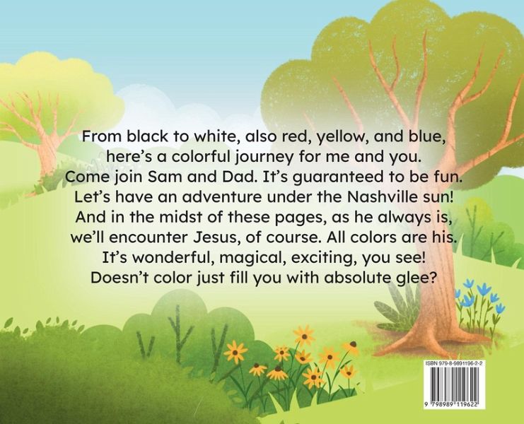 From black to white, also red, yellow, and blue, Here's a colorful journey for me and you. Come join Sam and Dad. It's guaranteed to be fun. They'll have an adventure under the Nashville sun. And in the midst of these pages, as he always is, We'll encounter Jesus, of course. All colors are his. It's wonderful, magical, exciting, you see! Doesn't color just fill you with absolute glee? There's lots of color out there. No denying it. I've got a favorite color. Do you know yours yet? Christian parents will love the safe, kid-friendly and Jesus-forward content, while their children will adore the vivid illustrations and clever rhymes, all while learning colors. If you look closely, you may even notice some familiar scenes from Nashville, Tennessee!