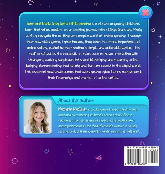 Sam and Molly: Stay Safe While Gaming is a vibrant, engaging children's book that takes readers on an exciting journey with siblings Sam and Molly as they navigate the exciting yet complex world of online gaming. Through their new video game, 'Cyber Heroes', they learn the critical importance of online safety, guided by their mother's simple and actionable advice. This book emphasizes the necessity of rules such as never interacting with strangers, avoiding suspicious links, and identifying and reporting online bullying, demonstrating that safety and fun can coexist in the digital world. This essential read underscores that every young cyber hero's best armor is their knowledge and practice of online safety.