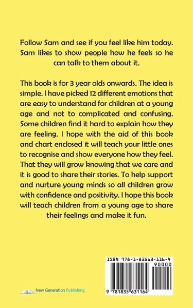 Follow Sam and see if you feel like him today. Sam likes to show people how he feels so he can talk to them about it. This book is for 3 year olds onwards. The idea is simple. I have picked 12 different emotions that are easy to understand for children at a young age and not to complicated and confusing. Some children find it hard to explain how they are feeling. I hope with the aid of this book and chart enclosed it will teach your little ones to recognise and show everyone how they feel. That they will grow knowing that we care and it is good to share their stories. To help support and nurture young minds so all children grow with confidence and positivity. I hope this book will teach children from a young age to share their feelings and make it fun.