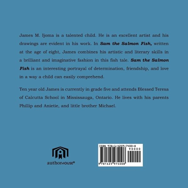 James M. Ijoma is a talented child. He is an excellent artist and his drawings are evident in his work. In Sam the Salmon Fish, written at the age of eight, James combines his artistic and literary skills in a brilliant and imaginative fashion in this fish tale. Sam the Salmon Fish is an interesting portrayal of determination, friendship, and love in a way a child can easily comprehend. Ten year old James is currently in grade five and attends Blessed Teresa of Calcutta School in Mississauga, Ontario. He lives with his parents Phillip and Anietie, and little brother Michael.