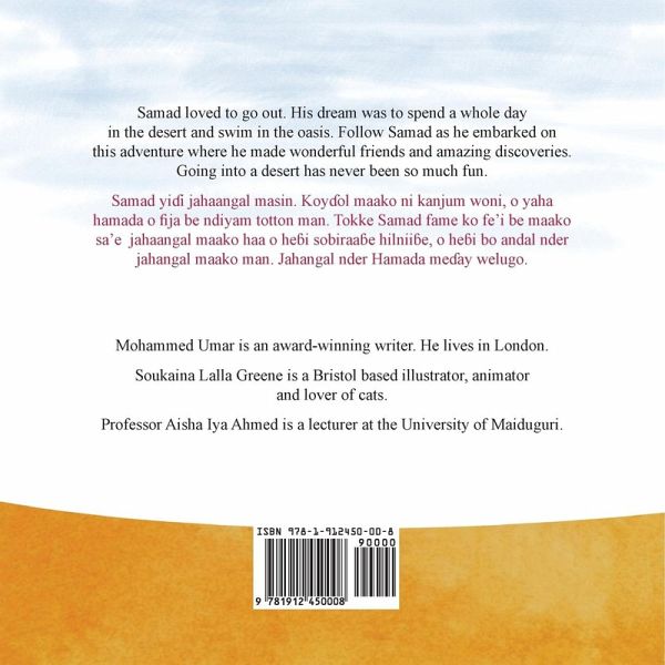 Samad loved to go out. His dream was to spend a whole day in the desert and swim in the oasis. Follow Samad as he embarked on this adventure where he made wonderful friends and amazing discoveries. Going into a desert has never been so much fun. Samad yi¿i jahaangal masin. Koy¿ol maako ni kanjum woni, o yaha hamada o fija be ndiyam totton man. Tokke Samad fame ko fe'i be maako sa'e jahaangal maako haa o he¿i sobiraäe hilnii¿e, o he¿i bo andal nder jahangal maako man. Jahangal nder Hamada me¿ay welugo. A bilingual edition of this book is available in the following languages: Acholi, Afrikaans Amharic, Arabic, Bemba, Chichewa, Chinyanja, Dinka, Fulfulde, German, Gikuyu, Hausa, Kinyarwanda, Kirundi, Luganda, Mandinka, Mende, Ndebele, Nobiin, Oromo, Shona, Sesotho, Somali, Setswana, Soninke, Swahili, Swedish, Tigrinya, Wolof, Xhosa, Yao, Yoruba, Zulu.