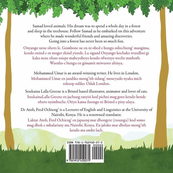 Samad loved animals. His dream was to spend a whole day in a forest and sleep in the treehouse. Follow Samad as he embarked on this adventure where he made wonderful friends and amazing discoveries. Going into a forest has never been so much fun. Onyango nene ohero le. Gombone ne en ni obed e bungu odiechieng’ mangima, kendo onind e ot moger ekind yiende. Lu sigand Onyango kochako wuodhni gi kaka nene oloso osiepe mabeyobeyo kendo ofwenyo weche mathoth. Wuotho e bungu en gimamit miwuoro ahinya. A bilingual edition of this book is available in the following languages: Acholi, Akwapim, Amharic, Asante, Ewe, Fante, Gikuyu, Hausa, Igbo, Kalenjin, Kirundi, Luganda, Oromo, Swahili, Tigrinya, Yoruba.